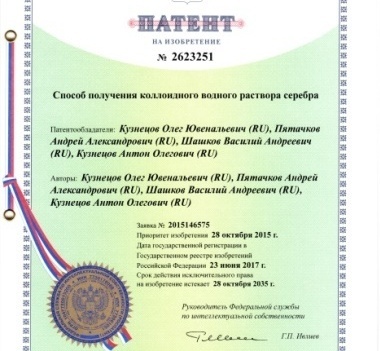 - Способ получения коллоидного водного раствора серебра. Патент РФ № 2623251 Бюл.изобр.№18 23.06.2017. Кузнецов О.Ю., Пятачков А. А., Шашков В.А., Кузнецов А.О.
