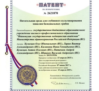 - Питательная среда для глубинного культивирования мицелия базидиальных грибов. Патент РФ № 2621870 Бюл.изобр.№16 07.06.2017. Кузнецов О.Ю., Ларин В.А., Калинина Н.Г., Кузнецов А.О., Пятачков А. А., Шашков В.А.