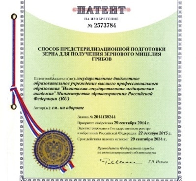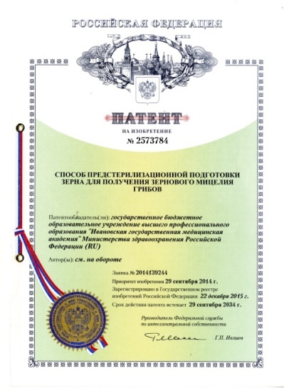 - Способ предстерилизационной подготовки зерна для получения зернового мицелия высших грибов. Патент РФ № 2573784, Бюл.изобр.№3 27.01.2016. Кузнецов О.Ю., Ларин В.А., Новикова Л.Ф., Кузнецов А.О.
