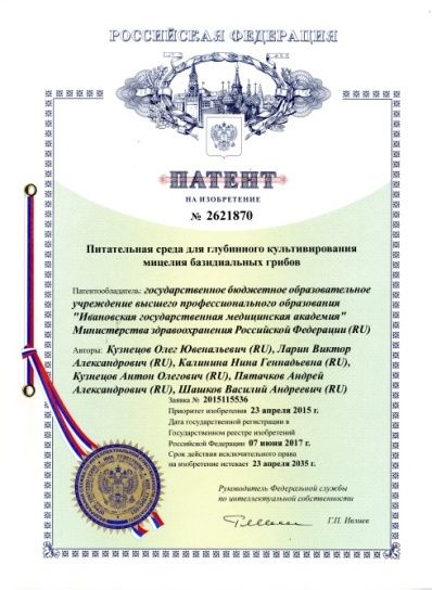 - Питательная среда для глубинного культивирования мицелия базидиальных грибов. Патент РФ № 2621870 Бюл.изобр.№16 07.06.2017. Кузнецов О.Ю., Ларин В.А., Калинина Н.Г., Кузнецов А.О., Пятачков А. А., Шашков В.А.