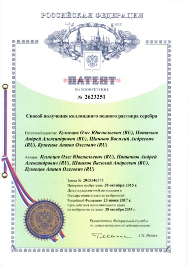 - Способ получения коллоидного водного раствора серебра. Патент РФ № 2623251 Бюл.изобр.№18 23.06.2017. Кузнецов О.Ю., Пятачков А. А., Шашков В.А., Кузнецов А.О.